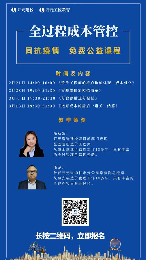 鑒于目前新型冠狀病毒嚴(yán)峻形式,為響應(yīng)國家號召減少人員流動,減少疫情傳播貢獻(xiàn)一份力。成都開元建筑職業(yè)技能培訓(xùn)學(xué)校&四川開元工匠教育科技有限公司聯(lián)合推出網(wǎng)絡(luò)直播 “同抗疫情 免費(fèi)公益課程” 之《全過程成本管控》系列課程。