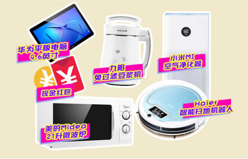 華為平板、小米空氣凈化器、海爾掃地機器人、美的微波爐、九陽豆?jié){機、50元現(xiàn)金紅包、隨機現(xiàn)金紅包、300元抵用券等。