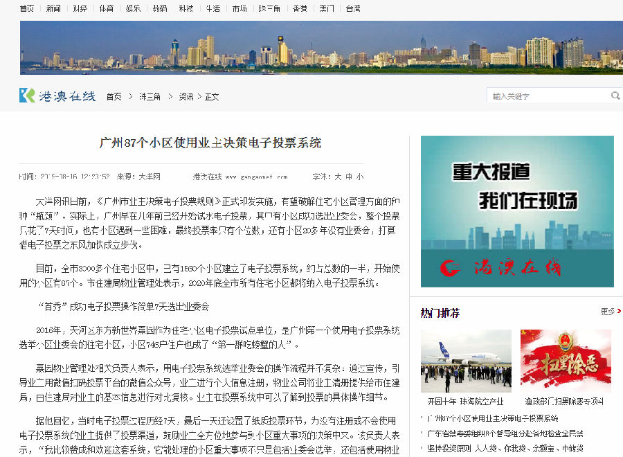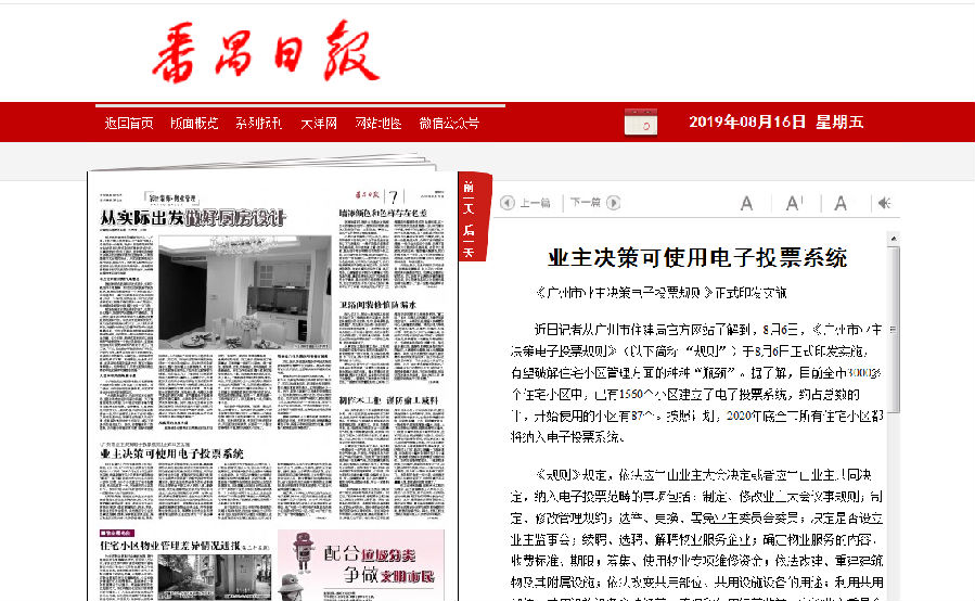 《廣州市業(yè)主決策電子投票規(guī)則》已于近日印發(fā)。目前廣州市3000多個住宅小區(qū)中,已經(jīng)有1560個小區(qū)建立了電子投票系統(tǒng),約占總數(shù)的一半,已經(jīng)開始使用的小區(qū)有87個。市住建局物業(yè)管理處表示,2020年底全市所有住宅小區(qū)都將納入電子投票系統(tǒng)。
