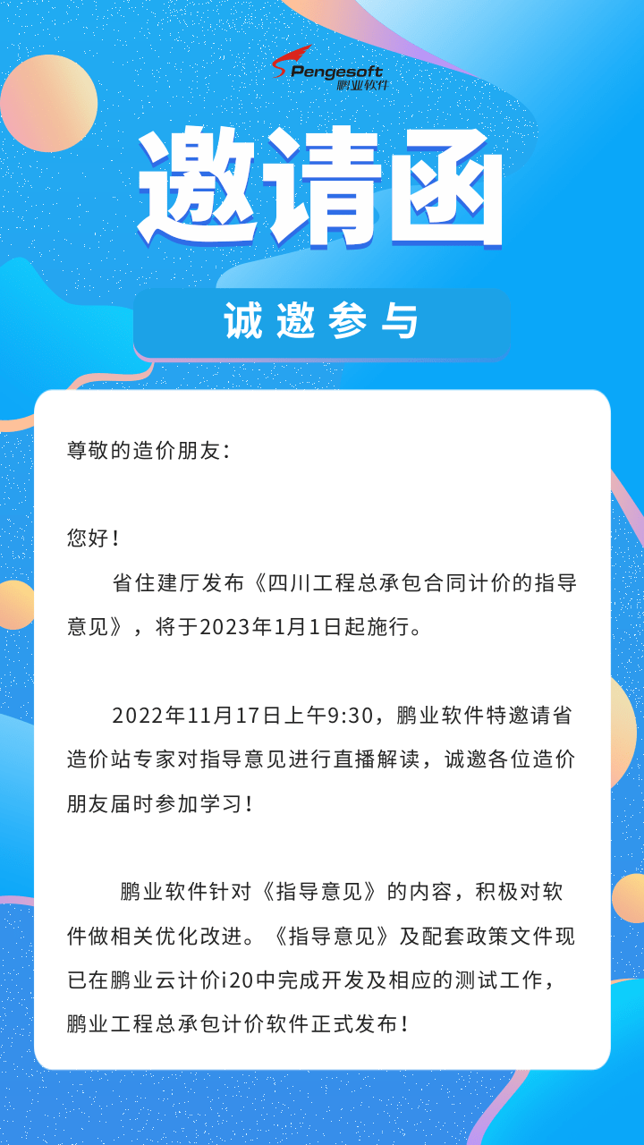 【邀請函】省站專家直播解讀《四川工程總承包合同計價的指導(dǎo)意見》,配套鵬業(yè)軟件發(fā)布!