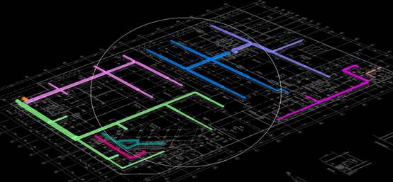 指定通風(fēng)空調(diào)圖形邊線,能一次性地完成整個(gè)通風(fēng)空調(diào)系統(tǒng)回路識別,自動區(qū)分回路,自動區(qū)分不同規(guī)格的通風(fēng)管道。