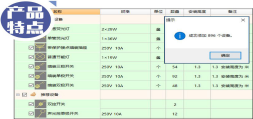 軟件自動識別設(shè)備表并與平面圖的設(shè)備進(jìn)行匹配,一次性地完成各種安裝設(shè)備數(shù)量的分類統(tǒng)計。在實際圖紙中,設(shè)備圖例表中的圖例并不完整,很多需要統(tǒng)計的設(shè)備圖例表中并沒有包括,軟件將其放置推薦設(shè)備或未知設(shè)備,根據(jù)實際情況選取是否識別,以保證在統(tǒng)計設(shè)備個數(shù)時不會漏項。