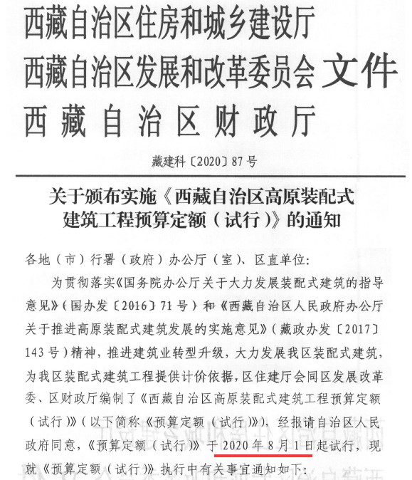 近年來,黨中央、國務(wù)院高度重視裝配式建筑的發(fā)展,推進(jìn)裝配式建筑發(fā)展是工程建設(shè)領(lǐng)域推進(jìn)生態(tài)文明建設(shè)、落實(shí)綠色循環(huán)低碳發(fā)展理念的重要舉措,是提高工程質(zhì)量和施工安全水平、提升建筑品質(zhì)的重要手段,是推動(dòng)建造方式轉(zhuǎn)變、加快建筑業(yè)轉(zhuǎn)型升級的重要途徑。西藏自治區(qū)住建廳、發(fā)改委、財(cái)政廳聯(lián)合發(fā)布“藏建科〔2020〕87號關(guān)于頒布實(shí)施《西藏自治區(qū)高原裝配式建筑工程預(yù)算定額(試行)》的通知”,高原裝配式預(yù)算定額將于8月1日起執(zhí)行,為西藏地區(qū)裝配式建筑提供計(jì)價(jià)依據(jù)。