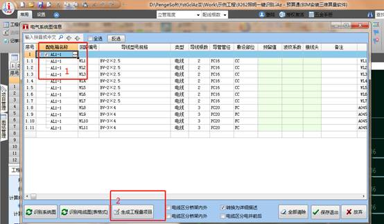 3.進(jìn)入識別后電氣系統(tǒng)圖的列表,輸入對應(yīng)的配電箱名稱并勾選相應(yīng)的配電箱1,然后單擊生成工程量2即可,如下圖: