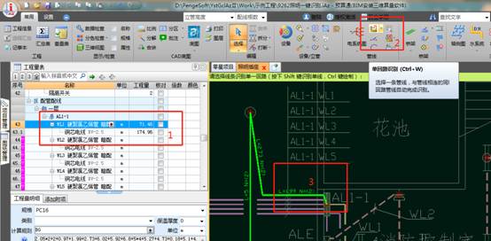 1.在工程量表中選中相應(yīng)的回路1,單擊單回路識別按鈕2,按照提示選中圖紙中相應(yīng)的回路3,單擊即可完成該回路的識別。如下圖