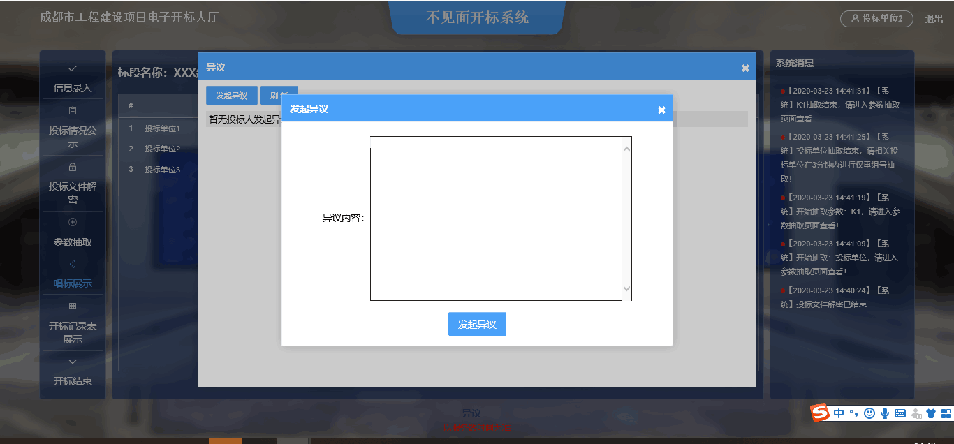 (1)開始開標后,投標人點擊【提出異議】,再點擊【發(fā)起異議】。