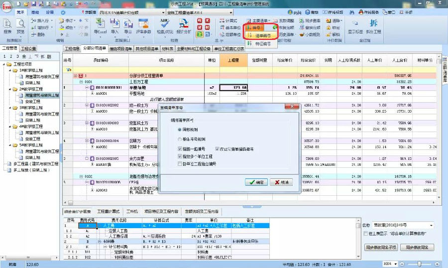 工程編制完成后,一般都需要按照清單規(guī)范要求進(jìn)行編號,以滿足編制要求進(jìn)行清單項(xiàng)目增加順序碼和編號。如圖示: