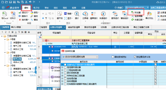 “附加費”功能以定額說明為依據(jù),可根據(jù)工程實際需求,靈活選擇計取方式、位置。實現(xiàn)快速、批量的計取費用,提高編制人員工作效率。