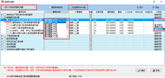 ⒉、若勾選“按定額條件計取”選項,則自動按定額號條件智能判斷并計取附加費;不勾選則強制對當(dāng)前項及子項按選擇附加費內(nèi)容計取。
