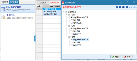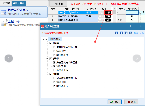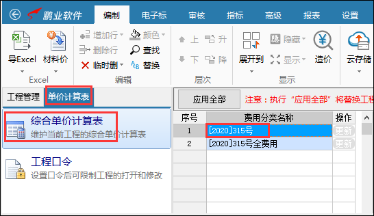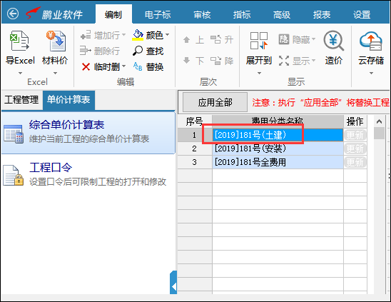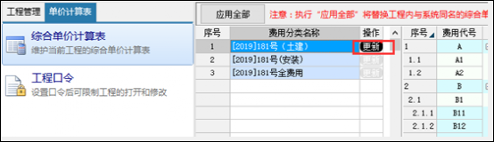 執(zhí)行"應(yīng)用全部”將替換工程內(nèi)與系統(tǒng)同名的綜合單價(jià)計(jì)算表