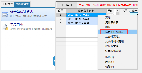 1.3 對單價(jià)計(jì)算表里面需要調(diào)整的費(fèi)用進(jìn)行修改,并右鍵選擇指定工程應(yīng)用
