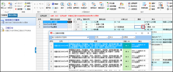 2.2對需要更新的單價(jià)計(jì)算表進(jìn)行調(diào)整,比如以[2019]181號(土建)計(jì)算表的調(diào)整為例,根據(jù)四川人工費(fèi)調(diào)整文件,需要調(diào)整相應(yīng)的人工綜調(diào)。點(diǎn)擊人工費(fèi)綜調(diào)這行對應(yīng)的費(fèi)率,在彈出的窗口選擇相應(yīng)的綜調(diào)系數(shù)。