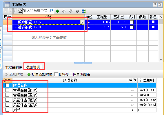 ②添加附項-附項選項里選需要的附項(如果沒有需要的項可以這添加、修改其名稱、單位、計算規(guī)則)