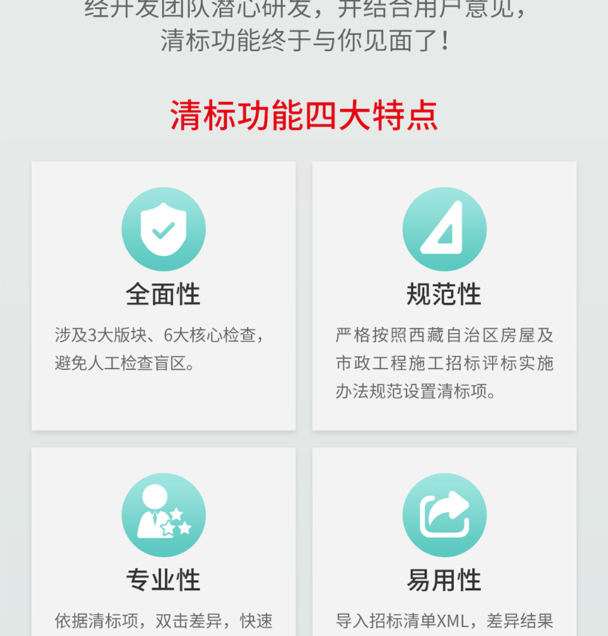 為更好的助力企業(yè)高效投標(biāo),協(xié)助投標(biāo)人編制投標(biāo)報價文件時進行高效、準(zhǔn)確的分析,排查編制過程中存在的異常問題,經(jīng)開發(fā)團隊潛心研發(fā),并結(jié)合用戶意見,清標(biāo)功能可以免費使用了!