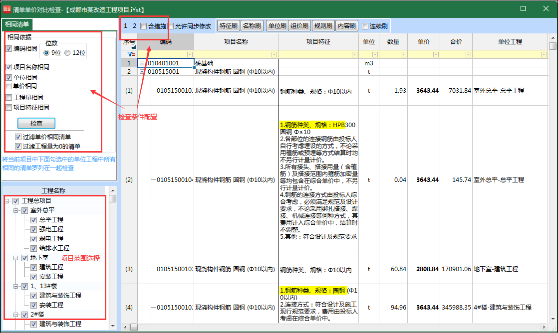 2、對檢查條件、項目范圍進行配置(特征不同時,將會用高黃字體顯示),可根據(jù)實際項目情況,檢查相同清單的特征、單價等是否一致。如圖示: