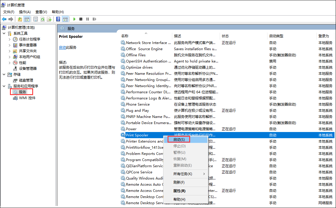 ①點(diǎn)擊計(jì)算機(jī)(我的電腦)圖標(biāo)--右鍵--管理里面找到【服務(wù)】 ,右鍵設(shè)置Print Spooler服務(wù)啟動(dòng);